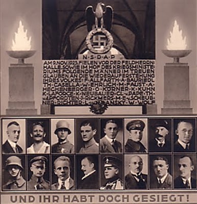 Hitler, Hess and others in front of the Feldherrnhalle November, 1934 marking the second annual celebration in memory of the failed putsch of 1923 at a time when the June 30 Night of the Long Knives massacre of June 30 continued to cast a sombre shadow over the festivities and meetings of the Alte Kämpfer, implied in his speech quoted below. Hitler had thus cancelled the annual commemorative march to the Feldherrnhalle that year, decreeing that the institution of an "Endowment for the Martrys of the Movement" be established. In a speech the previous night at the Bürgerbräukeller, he alluded not only to the victims of November 9, 1923, but also to those of June 30, 1934 in which those slain were indirectly accorded the status of having been “martyrs” for the Movement, for they had also died for Hitler, their blood shed having “become the baptismal water of the Third Reich.” "National Socialists! Deeply stirred, we stand again here today on this square. It is a reminder of our Movement’s first dead, and it is a symbolic act that the swearing-in of the Party’s recruits takes place on this square. This square of death thus becomes a place for swearing oaths in life. And we could conduct no fairer commemoration celebration at this site at which our comrades once gave their lives than the swearing-in of those who once again dedicate themselves to their work as the youth of Germany. You shall, I know, be just as loyal, just as brave as our old comrades! And you will have to be fighters! For there are still many, many opponents of our Movement in Germany. They do not want Germany to be strong. They do not want our Volk to be united. They do not want our Volk to defend its honour. They do not want our Volk to be free. They might not want it, but we want it, and our will will defeat them! And your will shall be with us, and you shall contribute to preserving and immortalising the will of that earlier time. We shall make even these last few bend under this will. We shall ensure that the times which once required these sacrifices will never again, within human power, return in Germany!