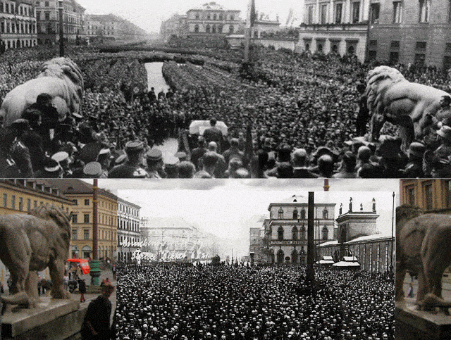 Remarkable photo by Hoffmann of Hitler attending a rally in the Munich Odeonsplatz to celebrate the declaration of war August 2, 1914. Hoffmann claimed that only after Hitler had visited the his studio in 1929 and told Hoffmann that he had been there, did he then