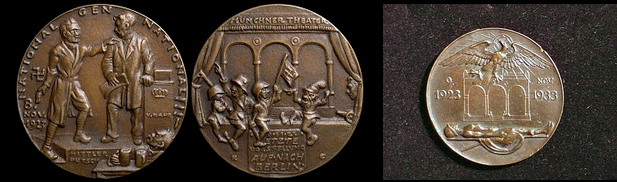 The first medallion depicting Hitler (name intentionally spelt wrong) satirising the failed putsch attempt as three dwarves are shown on the Munich Theatre stage carrying a gallows and Nazi flag with backward swastika with the third raising his right hand in a Nazi salute. Behind the curtain is von Kahr with a cannon as a Social Democrat points to both. The poster below reads "Etzte Vorstellung - Auf nach Berlin" (Last Performance - On To Berlin). The maker of this medal, Karl Goetz, (who had also been responsible for the infamous Lusitania medal during the Great War) had to hunt down all copies to save himself from the wrath of the Nazis upon their takeover of power when they came out with their own medal honouring the putsch, shown on the right.