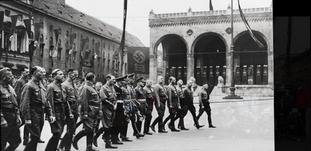 SA men marching on the corner of Ludwigstraße and Galeriestraße onto Odeonsplatz. It was here that Hitler spent most of his time before taking power of Germany in 1933.