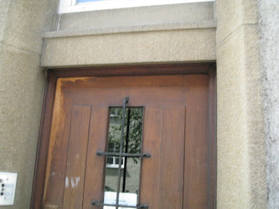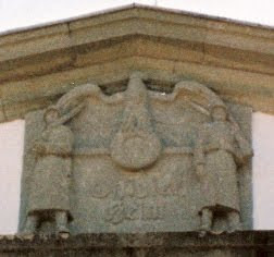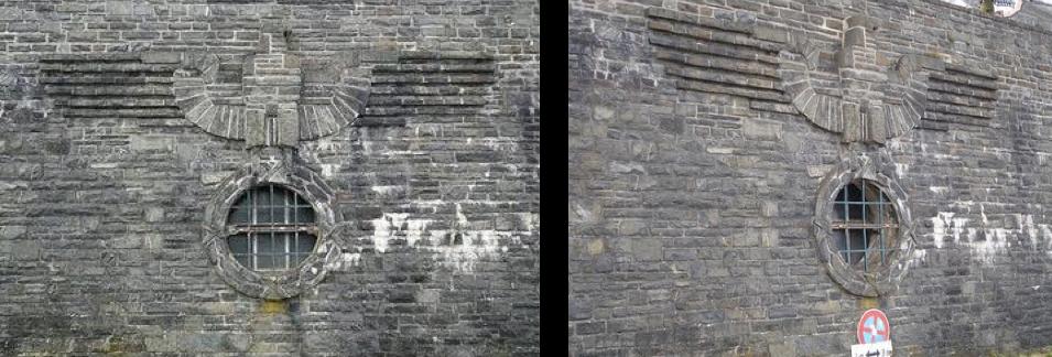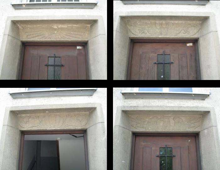 Over the side door a Nazi eagle remains, missing only its swastika whilst at the other end a wreath is shorn of its offending symbol as well.