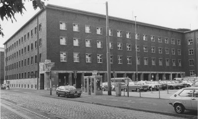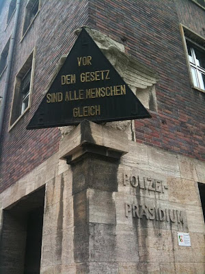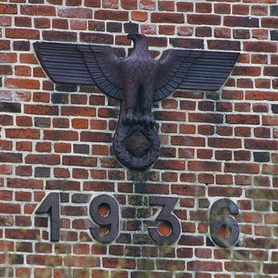 The Nazi eagle over the entrance of police headquarters at Jürgensplatz remains, but is covered by a plaque reading "All are equal before the law." Built from 1929 to 1932, this served as headquarters for representatives of the ϟϟ Upper Section West, the 20th SS regiment, the 6th ϟϟ Rider standard and the 4th ϟϟ Lieutenant Colonel.
