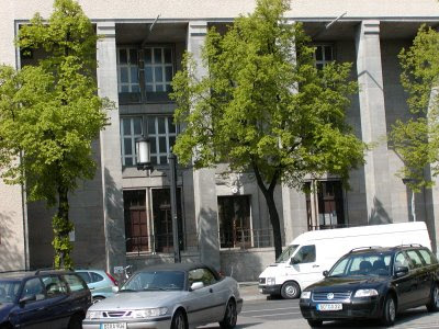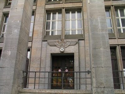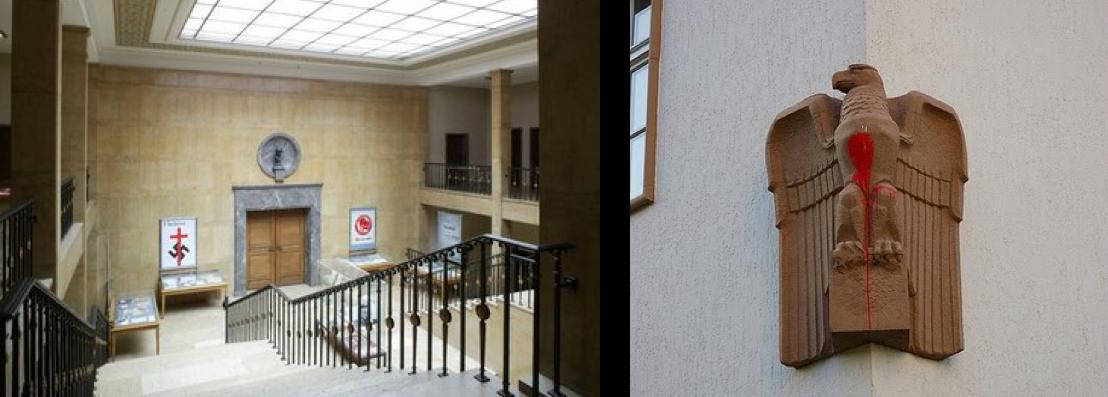 Victims of Hitlerism still have to endure this symbol when entering a government building. That this building served a key role in the unrestrained plundering of the Jews during the Nazi period, its continued existence is all the more striking.