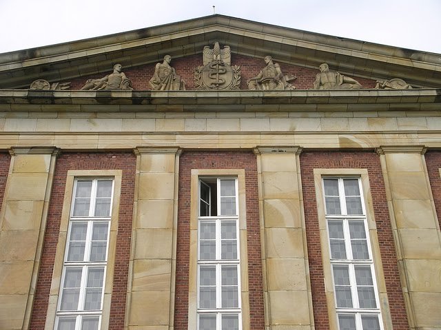 At the top of the city's Hauptklinik at 56-58 Esmarchstrasse is a Nazi eagle with the caduceus replacing the swastika.The