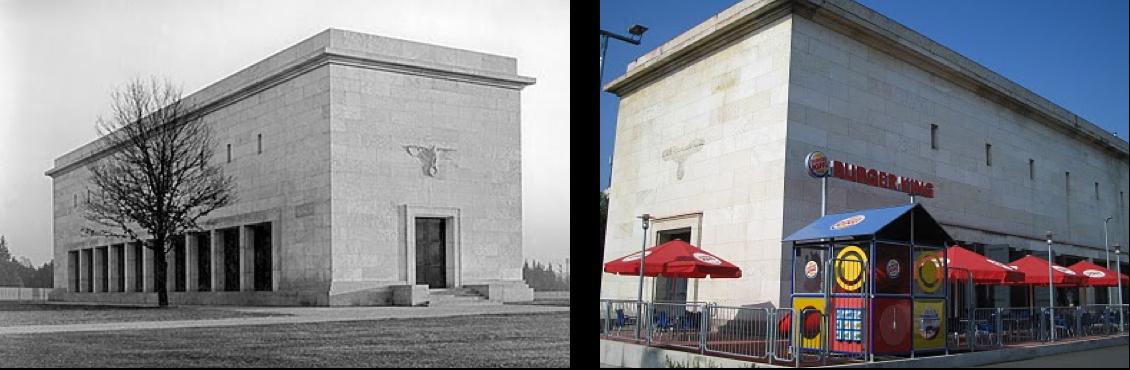 Located behind the Grandstand on Regensburger Straße, the station was built in 1936 by Albert Speer for the power supply to the Party Rally Grounds. It supplied the power for the Party Rally Grounds and the so-called 'Cathedral of Light.' The energy demands of lighting and the general running of the grounds was extremely high. The transformer station could handle the power supply for a major city.You can still see the faint outline of the Reich eagle which apparently does not cause concern to Burger King.