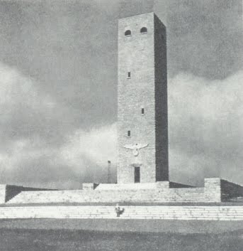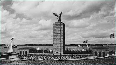 At the east shore of Kiel Bay is the U-boat Memorial at Möltenort to the memory of submariners who lost their lives. The reichsadler is by Fritz Schmoll, responsible for others seen on this site. The photo on the left shows its inauguration in 1938.