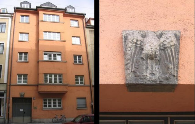 The eagles that are allowed to continue to adorn the building were designed by Munich artist Kurt Schmid Ehmen (1901-1968) who had specialised in reichsadlers and swastikas (such as those found at the "Ehrenmal" der Feldherrnhalle and Nazi party rally grounds in Nuremberg and the Reich Chancellery in Berlin).