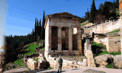 Drake at the foot of the Sacred Road leading to the original sacred precinct. From here it climbed north-east to the terrace of the temple of Apollo, and reached the temple terrace at its south-east corner. From there one reached the temple and altar of Apollo, in the immediate vicinity of which stood the Serpent Column , a votive gift donated by the Greeks after their victory over the Persians. The Sacred Way was lined with anathema and the treasuries built by the Greek cities and poleis to store their offerings. In contrast to the neatly lined up or grouped treasury houses of other sanctuaries like Olympia or Delos the treasury at Delphi was only loosely arranged. Although they were mostly located along the Holy path, they also filled free spaces off this path, occupying the available area unregulated, sometimes occupying special places for reasons of representation, sometimes reacting to existing treasury houses with competing buildings. In between, larger and smaller votive gifts were interspersed, until the decreasing space forced the remaining gaps to be filled. Only thirteen treasury buildings mentioned in ancient tradition - especially by Pausanias , but also by Herodotus, Plutarch, Appian and Strabo - for Delphi are compared to the foundations and building remains of 32 excavated treasury buildings alone in the area of the sanctuary of Apollo which testify to the considerable effort involved in their foundation, which was expressed in the material and building decorations. Ten of the buildings in the Apollon district, mostly from the 6th century BCE have been identified with certainty, partly based on the date, partly on the basis of the pictorial decoration or even, as in the case of Cnidus, the surviving dedicatory inscription. BC, some in the 5th century BC. B.C., last the treasury of Thebes only 346 BC erected.