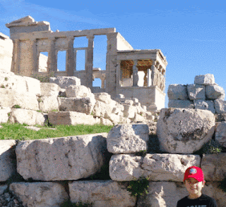 a product of reconstruction. On the left I'm at the Erechtheum, comparing the view today with how it appeared before the extensive renovations and shown in Frederick Edward Gould, the 9th Earl of Cavan's With the Yacht, Camera, and Cycle in the Mediterranean published in 1895. On the right below is Drake Winston a generation later showing the difference from the other side.